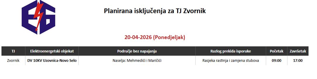 Preduzeće Elektro-Bijeljina obavještava građane da će u ponedjeljak, 20. aprila 2026. godine, doći do planskog prekida u snabdijevanju električnom energijom na području Zvornika.