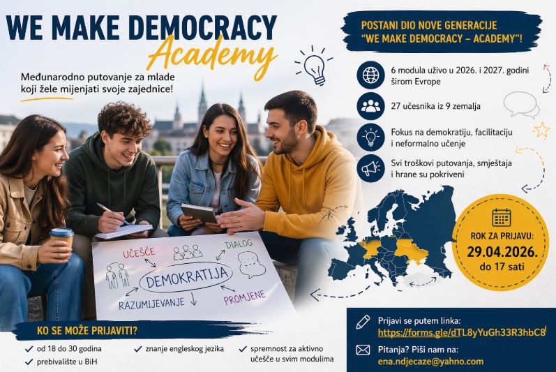 Udruženje Naša djeca Zenica objavilo je poziv za mlade iz Bosne i Hercegovine da se prijave za učešće u međunarodnom projektu We Make Democracy - Academy, koji okuplja učesnike iz devet evropskih zemalja.