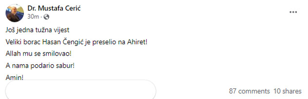 Jedan od osnivača SDA i dugogodišnji funkcioner i političar, Hasan Čengić, je preminuo u 65. godini. Vijest su objavili njegovi poznanici na društvenim mrežama.